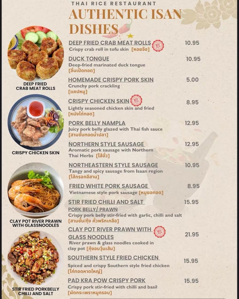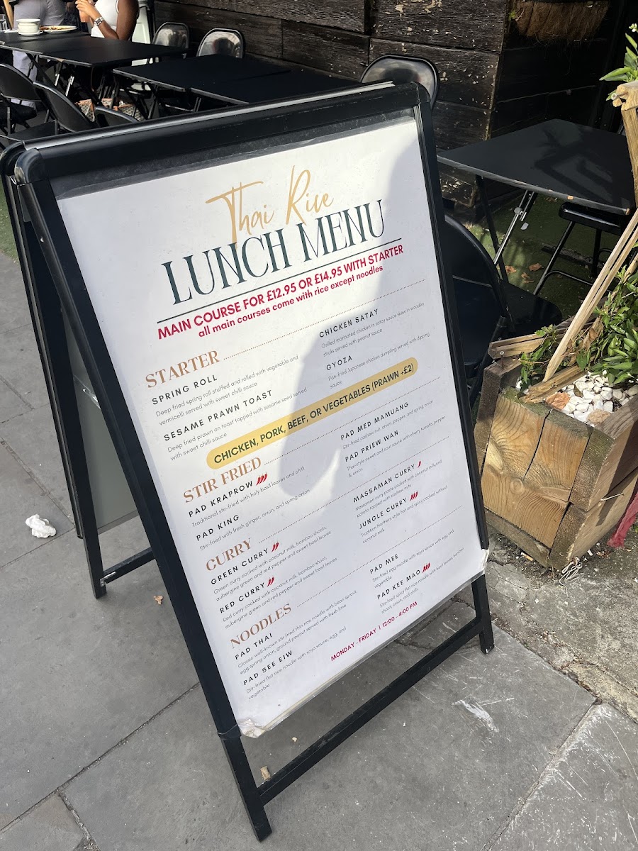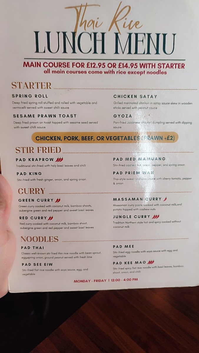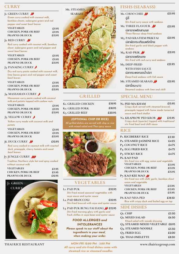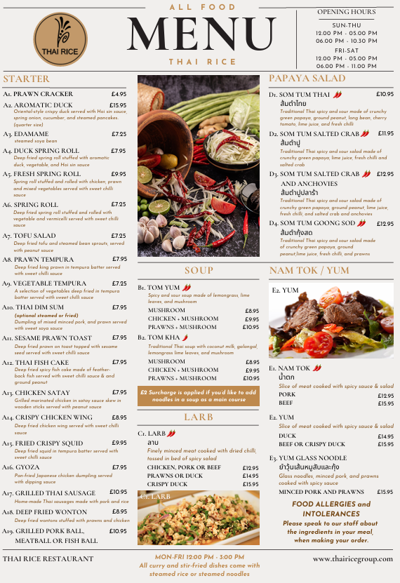 From a reviewer’s standpoint, the menu at Thai Rice is a lively showcase of classic Thai flavours with a mix of approachable starters and heartier mains that reflect both traditional and modern tastes. The starters set the tone with favourites like Prawn Crackers (£1.95), Quarter Aromatic Duck (£9.95) served with hoi sin and pancakes, and refreshing Edamame (£4.25), alongside crisp bites such as Duck Spring Roll (£4.95) and Fresh Spring Roll (£7.95) that hint at the balance of textures to come. Moving beyond the opening selections, the full takeaway menu unfolds into an extensive array of soups, grills, curries, noodles and more, with dishes like Green Curry (£6.50-£9.95) and Panaeng Curry (£6.95-£9.95) catering to a range of preferences and heat levels, while grilled options like Kai Yang (£7.95) and seafood highlights such as Grilled Seafood Platter (£25.00) showcase generous portions and bold seasoning. Noodle and rice sections continue the variety with staples like Pad Thai (£7.50-£9.95) and Kao Pad (£7.50-£9.95) complementing the salads and vegetable dishes that round out the menu. Overall, the restaurant’s offerings feel both comprehensive and inviting, with prices that align with its casual yet flavourful approach to Thai cuisine.