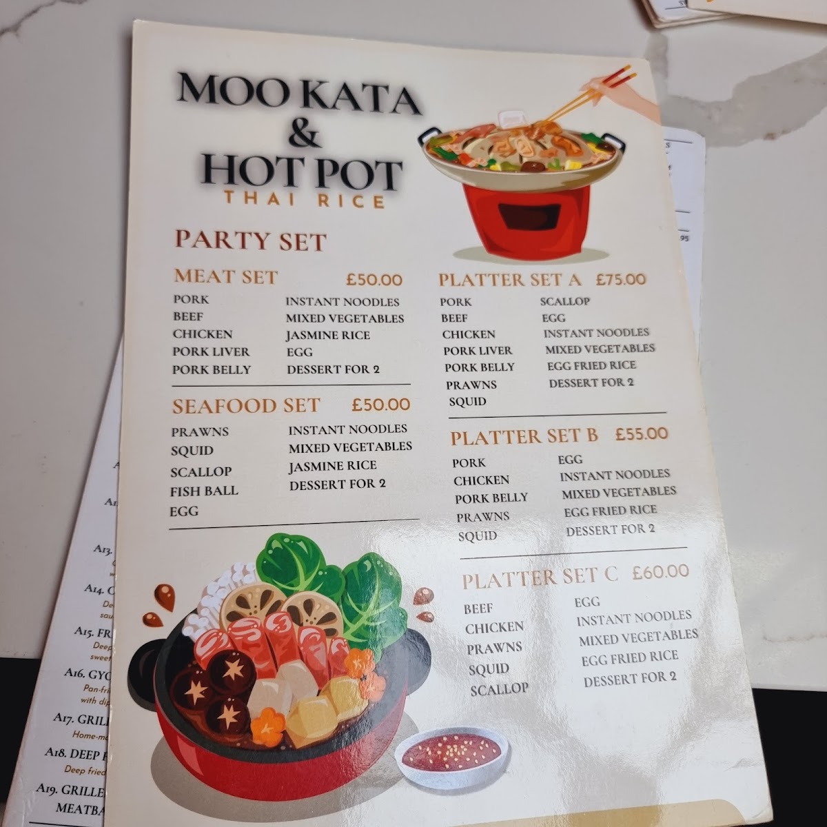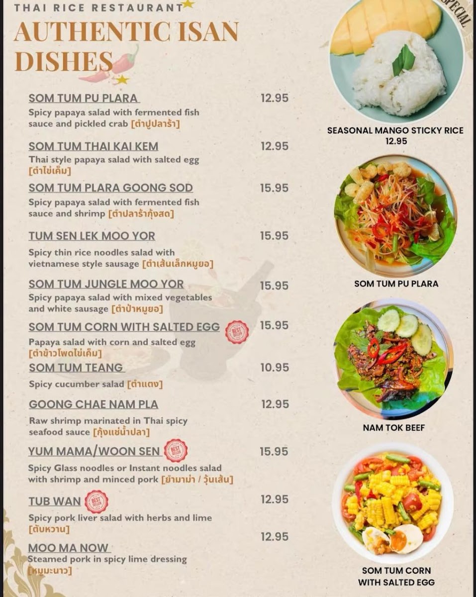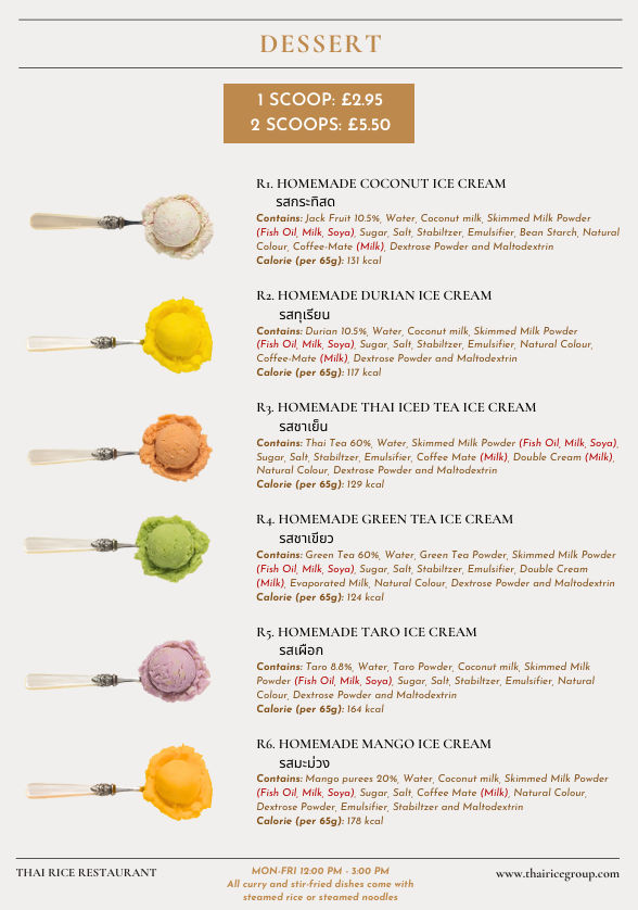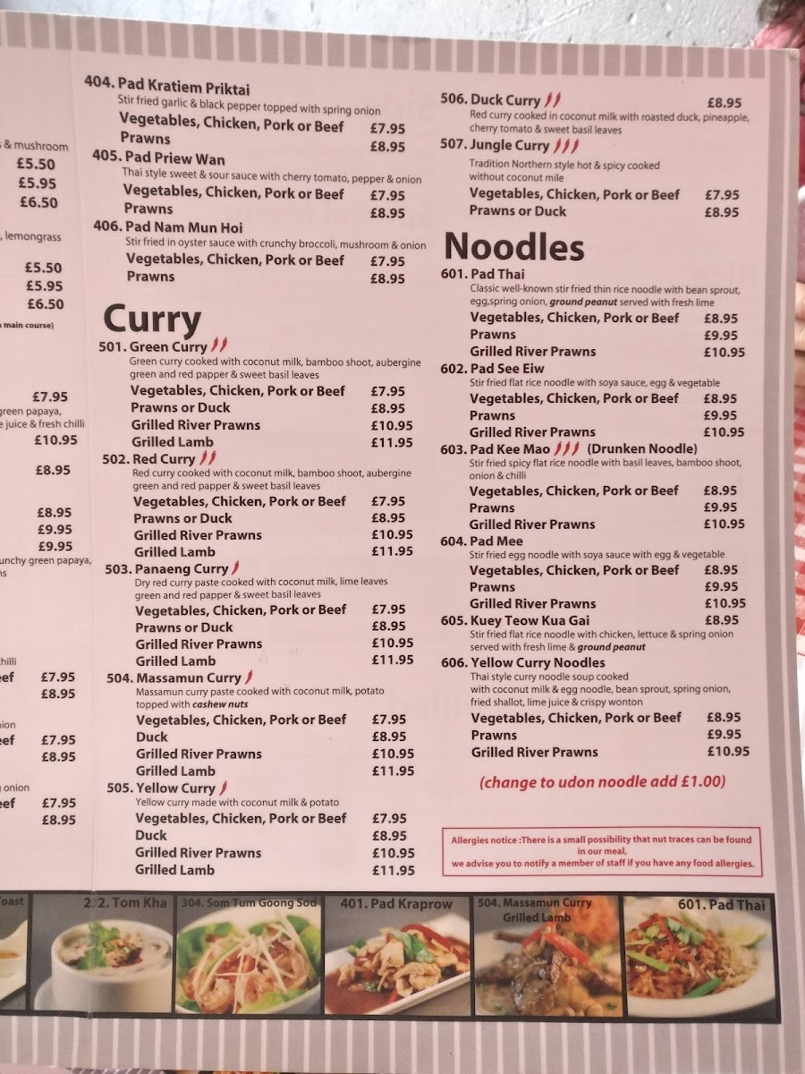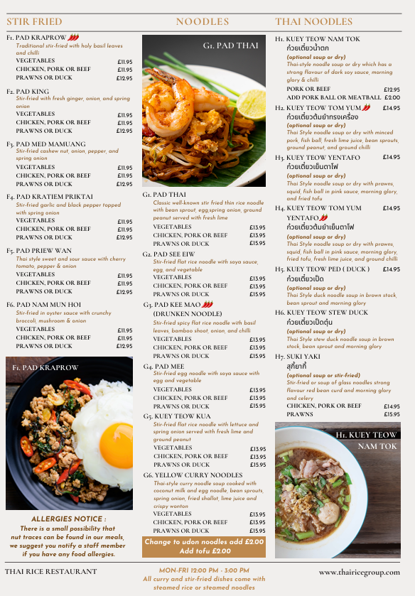From a reviewer’s standpoint, the menu at Thai Rice is a lively showcase of classic Thai flavours with a mix of approachable starters and heartier mains that reflect both traditional and modern tastes. The starters set the tone with favourites like Prawn Crackers (£1.95), Quarter Aromatic Duck (£9.95) served with hoi sin and pancakes, and refreshing Edamame (£4.25), alongside crisp bites such as Duck Spring Roll (£4.95) and Fresh Spring Roll (£7.95) that hint at the balance of textures to come. Moving beyond the opening selections, the full takeaway menu unfolds into an extensive array of soups, grills, curries, noodles and more, with dishes like Green Curry (£6.50-£9.95) and Panaeng Curry (£6.95-£9.95) catering to a range of preferences and heat levels, while grilled options like Kai Yang (£7.95) and seafood highlights such as Grilled Seafood Platter (£25.00) showcase generous portions and bold seasoning. Noodle and rice sections continue the variety with staples like Pad Thai (£7.50-£9.95) and Kao Pad (£7.50-£9.95) complementing the salads and vegetable dishes that round out the menu. Overall, the restaurant’s offerings feel both comprehensive and inviting, with prices that align with its casual yet flavourful approach to Thai cuisine.